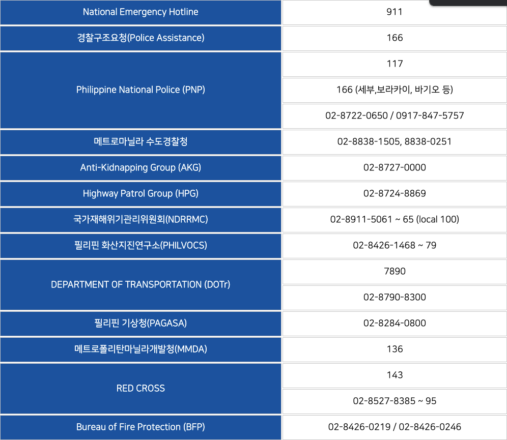 필리핀 현지 긴급 연락처에 대해서 알아보겠습니다.